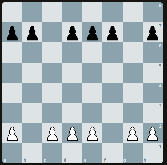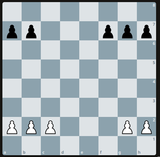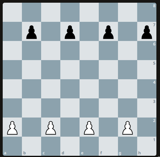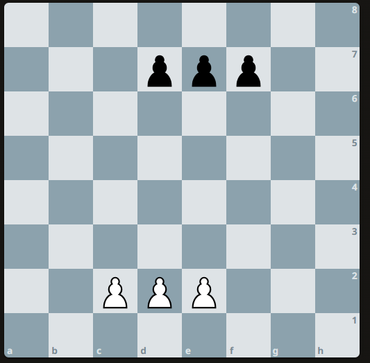 – Pelaajat asettavat 3–3 sotilasta laudalle: valkoiset b2, c2, d2 – mustat c7, d7, e7.