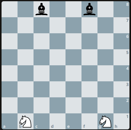 – Valkoiset ratsut lähtevät lähtöruuduistaan, ♘b1:stä ja ♘g1:stä, aivan kuten kaksi mustaa lähettiäkin aloittavat omilta aloitusruuduiltaan: ♝c8 ja♝ f8.